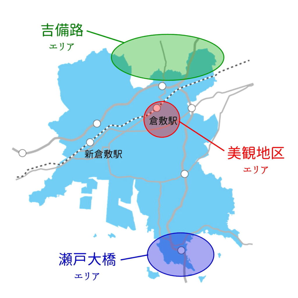 ひとくちに倉敷といっても、訪ねる地域によって見どころが大きく変わります。その中でもオススメなのは、この3エリアです。